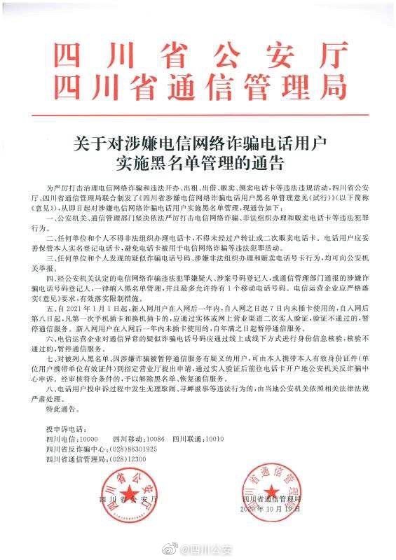 为严厉打击治理电信网络诈骗和违法开办、出租、出借、贩卖、倒卖电话卡等违法违规活动,切实保障人民群众合法权益,四川省公安厅、四川省通信管理局联合出台《关于对涉嫌电信网络诈骗电话用户实施黑名单管理的通告》(通告附后),从即日起对涉嫌电信网络诈骗电话用户实施黑名单管理。