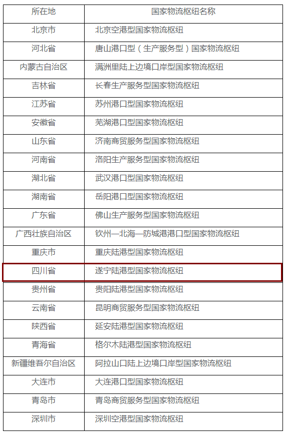 10月28日,记者从四川遂宁高新区获悉,近日,国家发展改革委、交通运输部联合印发《关于做好2020年国家物流枢纽建设工作的通知》(简称《通知》),包括遂宁陆港型国家物流枢纽在内的全国22个物流枢纽,入选2020年国家物流枢纽建设名单,遂宁也是四川唯一入选名单的地方。