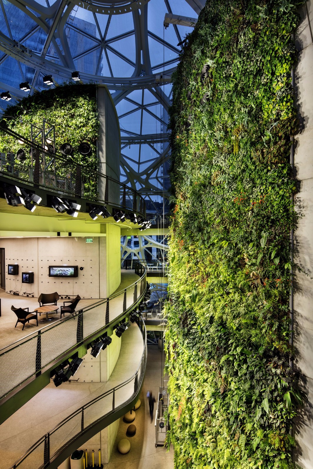 Spheres内部种满了植物,犹如让人身处在亚马逊雨林之中,这个温室内种植了来自五大洲50个国家的4万多植物,中心装饰是一棵50英尺(约15.2米)高的无花果树,大多数植物会开花,有些还能结果。大约90%的植物在搬进Spheres前,都会在郊区的温室里生长。