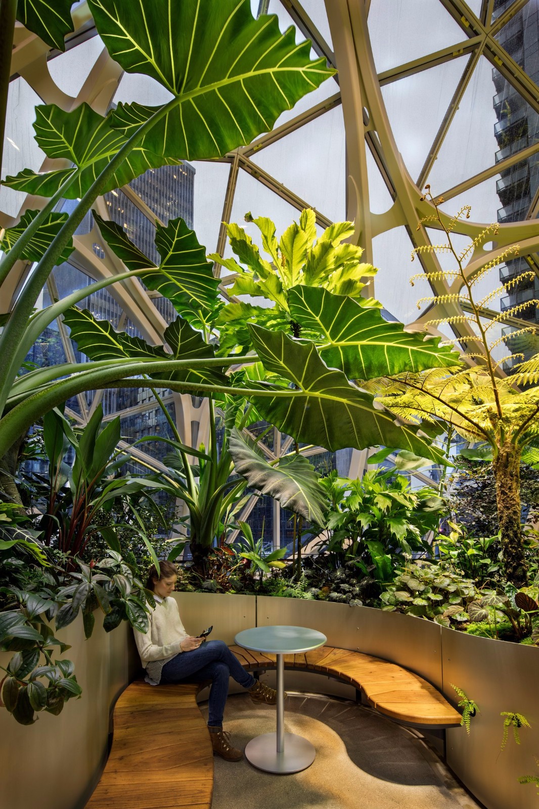 虽然在Spheres内工作会被大自然所掩盖,但如此“另类的工作空间”被设计得圆滑而简约,目的就是让员工在工作时能够忘记自己其实在工作。“我们要让员工离开正常的办公环境,所以你在周围看不到任何办公桌与房间”亚马逊园艺学家罗恩(Ron Gagliardo)表示。