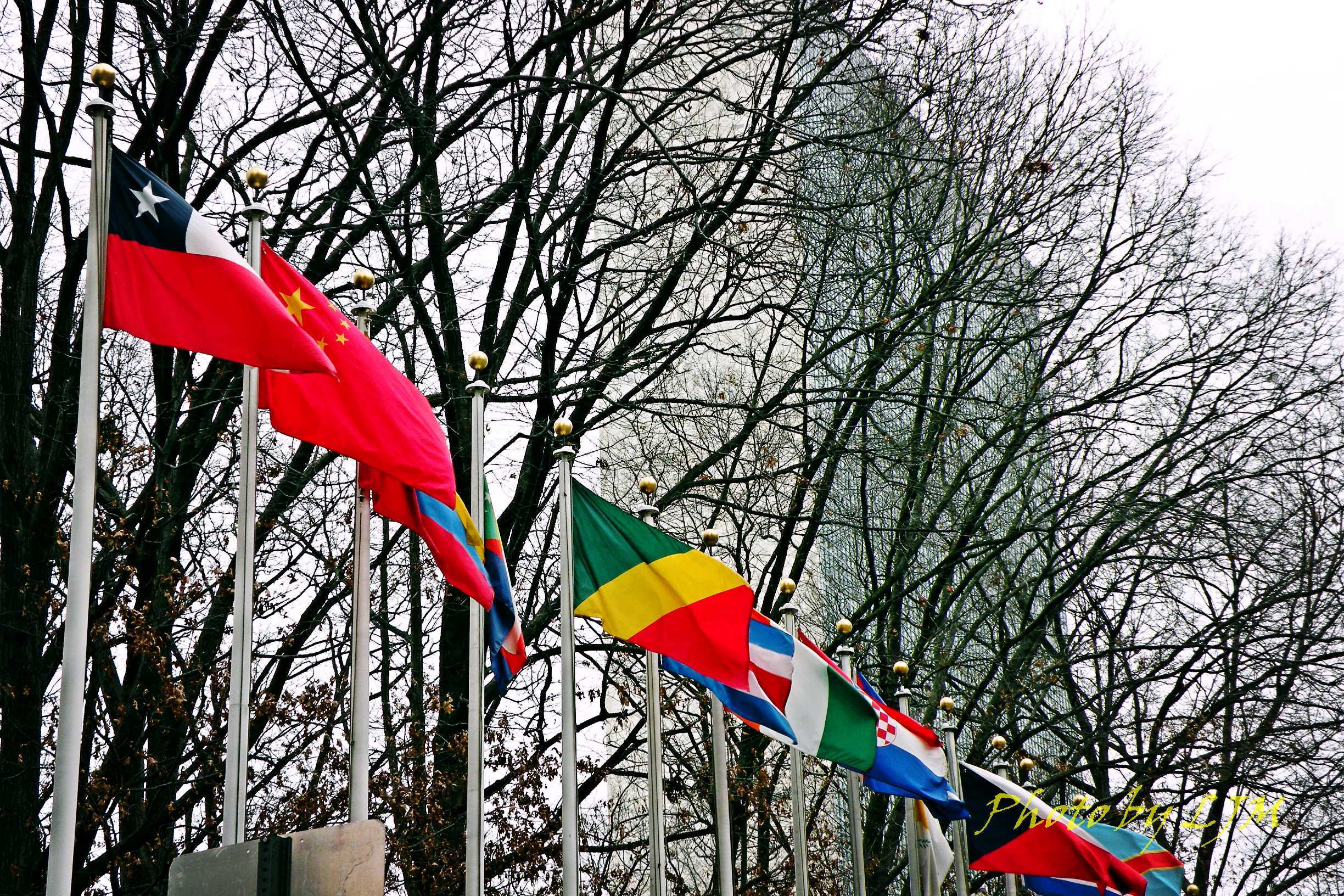 联合国总部——纽约的梵蒂冈。据说,美国人把纽约市中心的这块地租给了联合国,每年象征性地收一块钱租金。这是谣传。这块地不属于美国的领土。跨过大门,这是另一个国家。