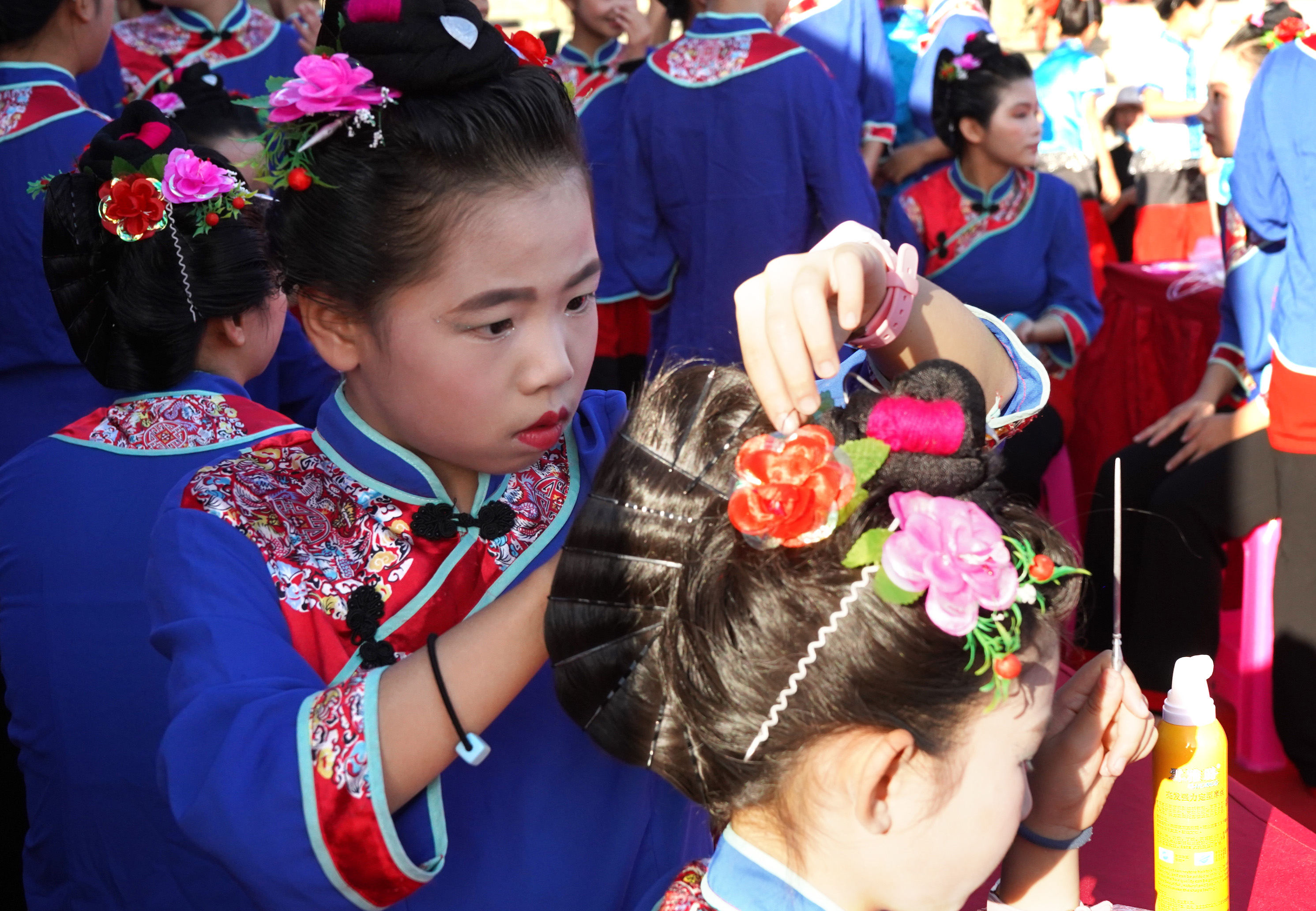 在第五届世界妈祖文化论坛期间举行的这场演出中,不到一个小时,在湄洲第一中心小学读六年级的林涵熙,就为同校的一年级小妹妹梳好了一个状似帆船的妈祖髻,领先于现场很多小伙伴。
