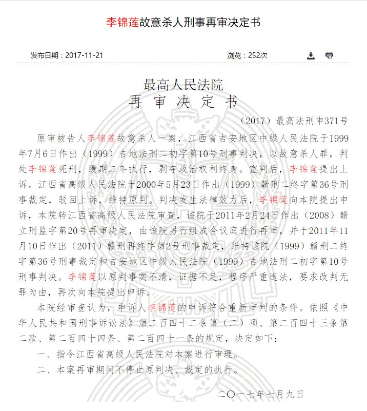 在江西高院再审维持原判之后,李锦莲继续向最高法院进行申诉。中国裁判文书网显示,2017年7月9日,最高法院第二次对该案做出再审决定,再一次指令江西高院对该案进行审理。