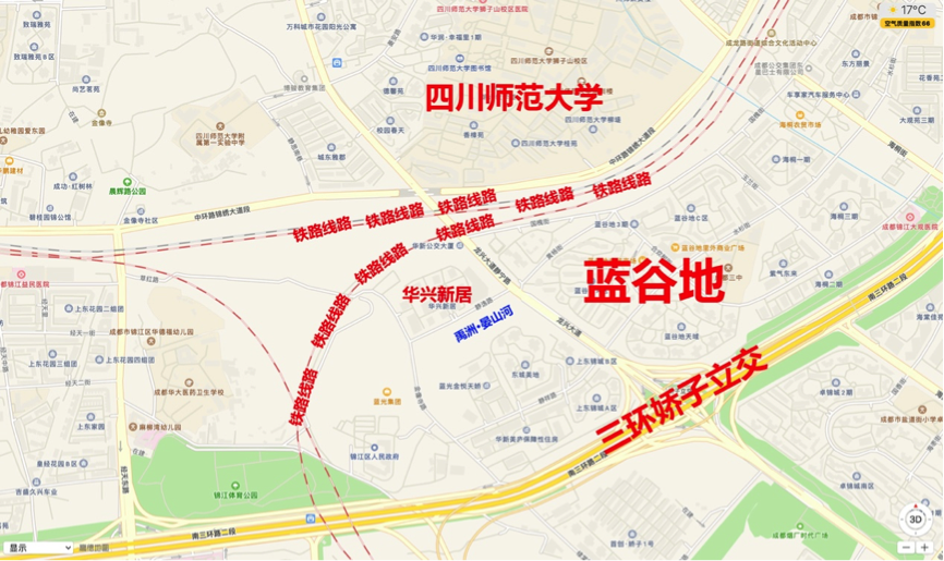 项目位于狮子山川师板块,东南2.7环位置,距离7号线四川师大站约1公里,南邻南三环,北近中环路。地块周边区域城市界面不算很好,南侧靠近东城美地、蓝光金悦天骄等小区,其西南侧靠近锦江区政府及锦江体育公园,北侧约900余米可直达四川师大商圈,生活氛围较为成熟。