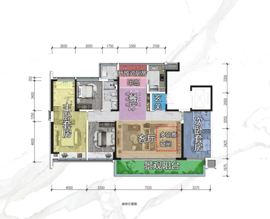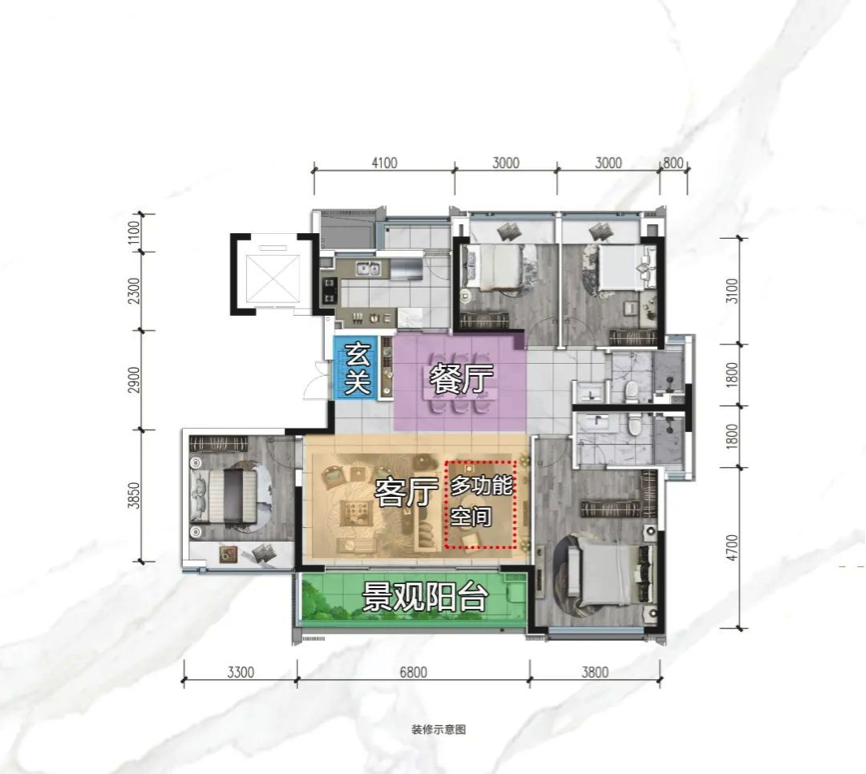 两种户型,以155㎡的户型为例,餐客厅面积约40㎡,并且带约6.8米宽的大阳台,空间尺度较大,让155㎡这个户型具有较强的会客功能。在建面约199㎡的户型中,同样延续三厅合一的户型设计,这种客餐厅一体设计,既强调各功能的有效分离,还预留了一个多功能区,满足了更大范围的居住需求。