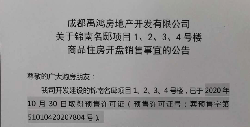 成都市住房和城乡建设局官方网站显示,10月30日,成都禹鸿房地产开发有限公司开发建设的晏山河(备案名:锦南名邸)项目1、2、3、4号楼192套住宅已经取得了预售许可证。
