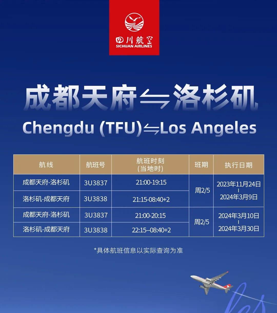 11月24日起,川航将恢复开通成都直飞美国洛杉矶航线,每周往返各两班。