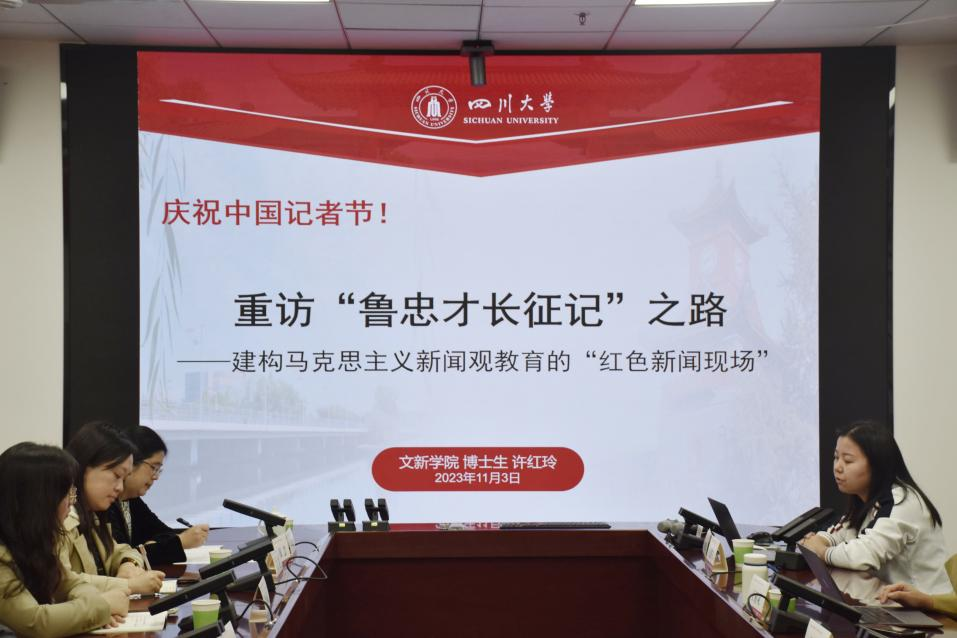 四川大学文学与新闻学院自2020年开始,已举办“纪念恩格斯诞辰200周年读书会”“读《毛泽东选集》,重温革命战争年代党报”等4场读书会。本次主题报告会暨座谈交流会,时值第24个中国记者节即将到来之际,“重访‘鲁忠才长征记’之路——建构马克思主义新闻观教育的‘红色新闻现场’”主题报告分享会,带领师生阅读经典新闻作品、重走红色之路,是在新闻教育及媒体实践中深植马克思主义新闻观,树立坚定的理想信念和严谨求实的作风与学风的又一次互动共学。