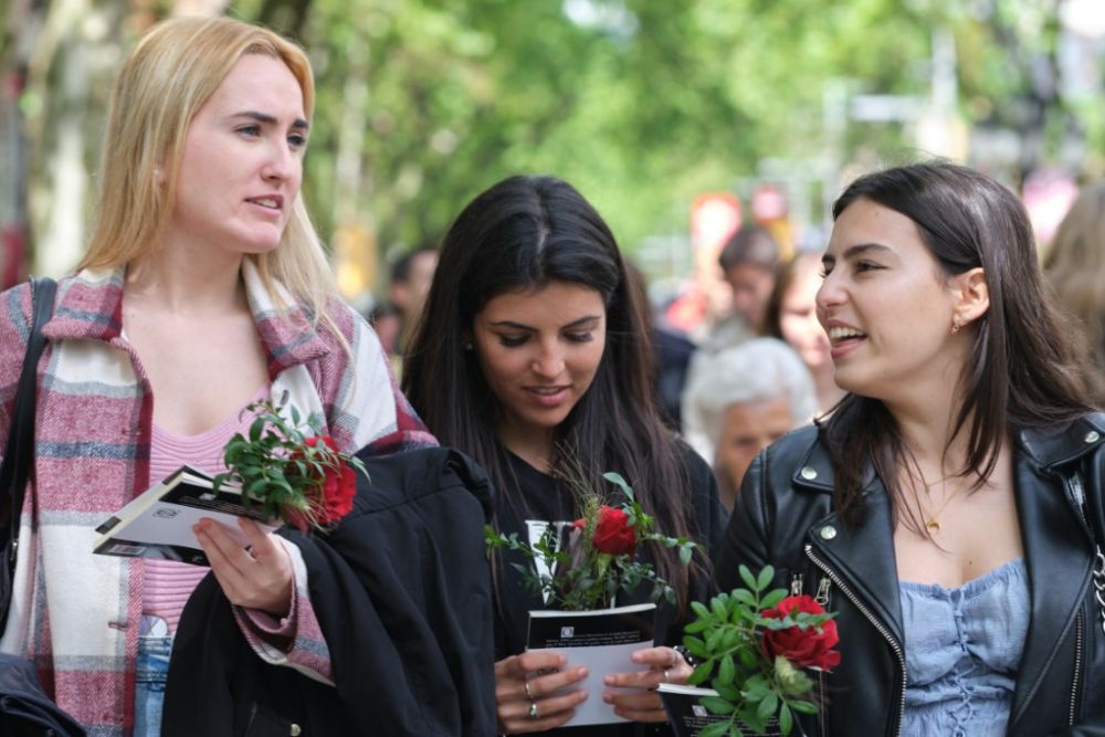 4月23日,人们手持玫瑰花走在西班牙巴塞罗那街头。新华社记者孟鼎博摄