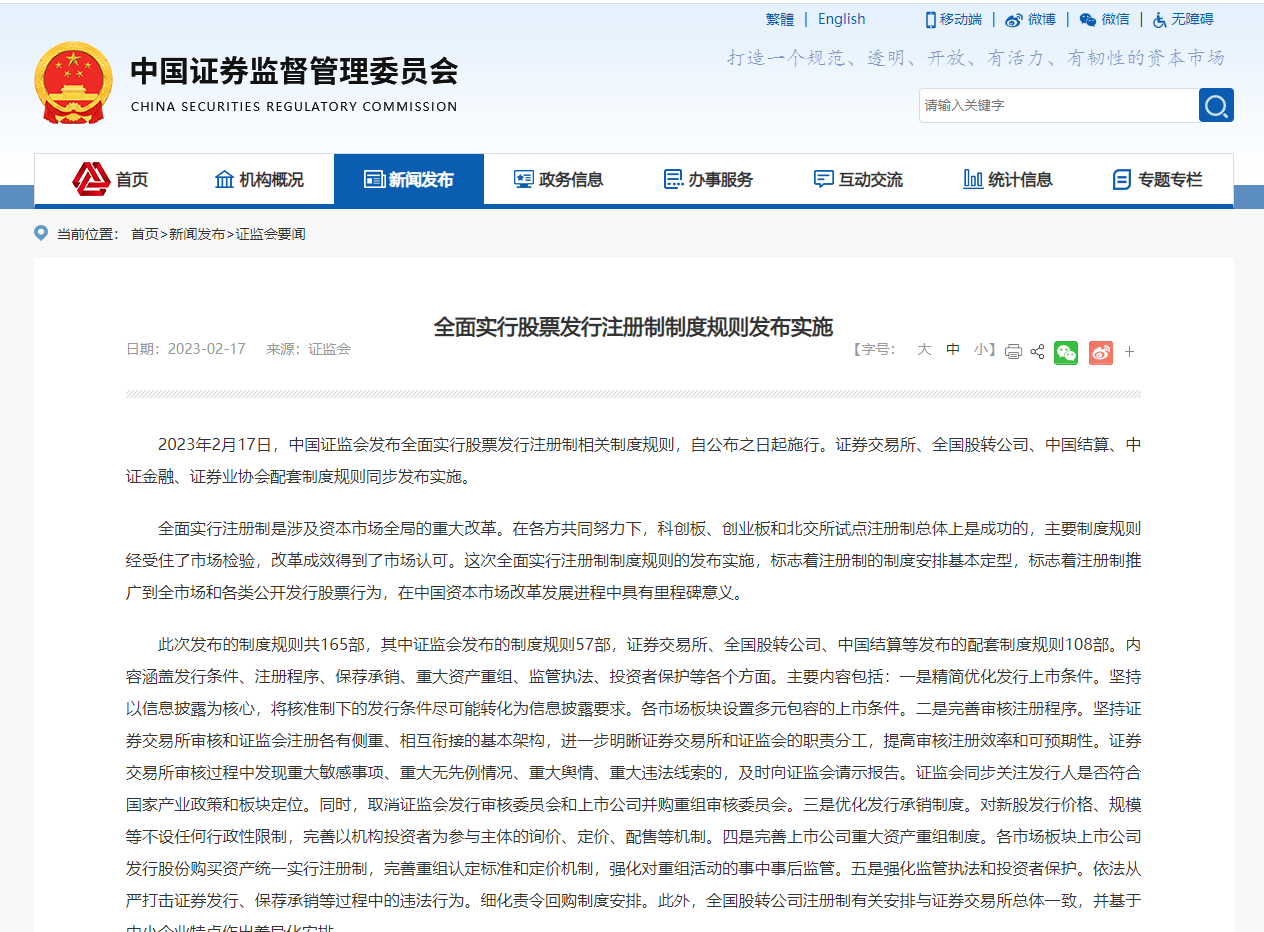 2月17日,中国证监会发布全面实行股票发行注册制相关制度规则,自公布之日起施行。证券交易所、全国股转公司、中国结算、中证金融、证券业协会配套制度规则同步发布实施。
