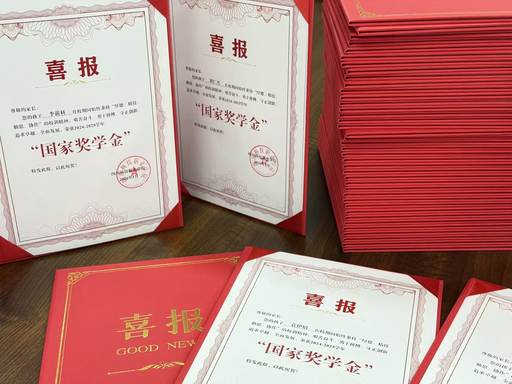 2月5日,记者从四川科技职业学院获悉,近期,学校向全国快递了46份特殊邮件,里面装着2024至2025学年国家奖学金的定制喜报。它们跨越山河,精准送达获奖学子家中,成为一份意义非凡的“新年礼物”。
