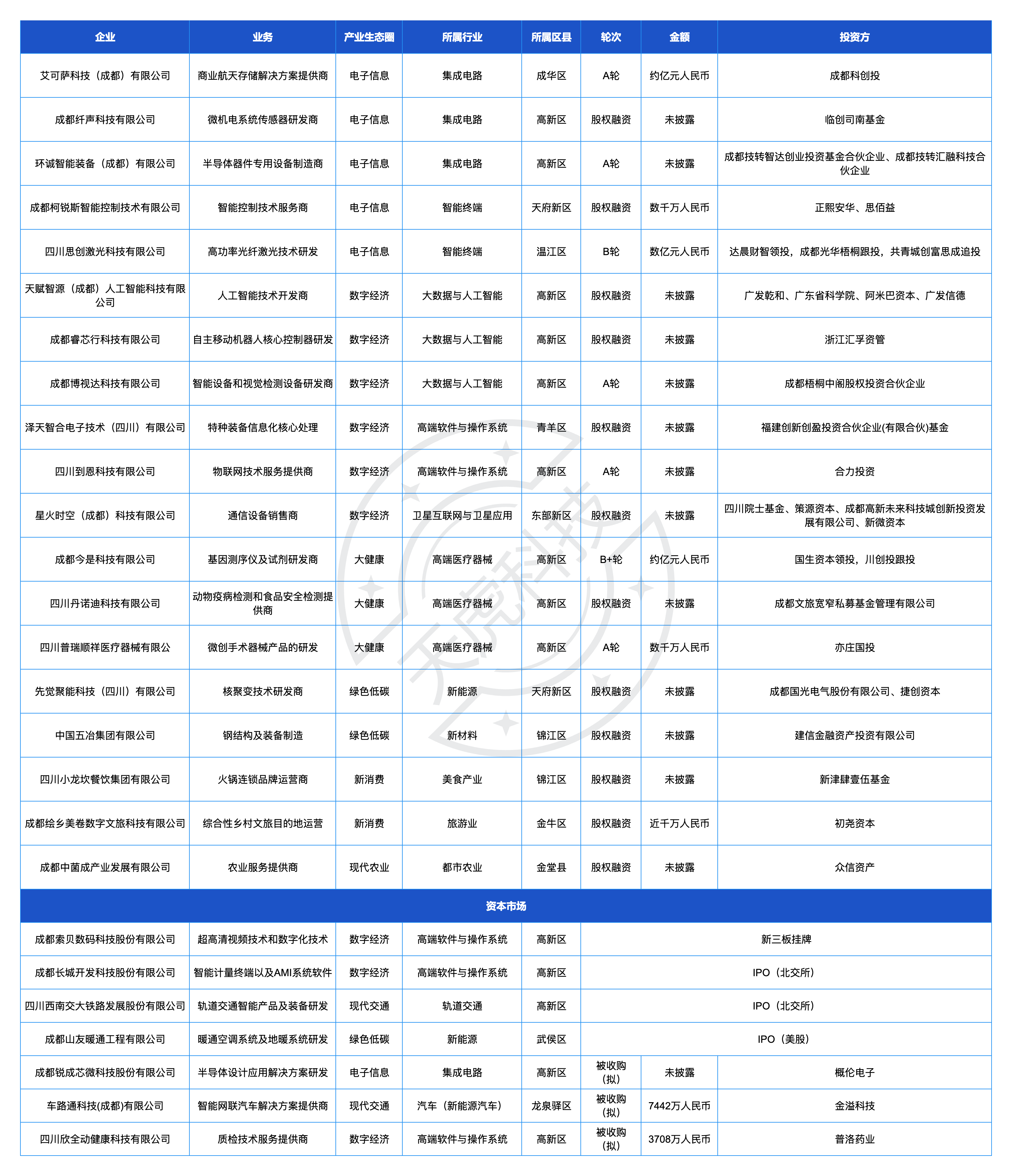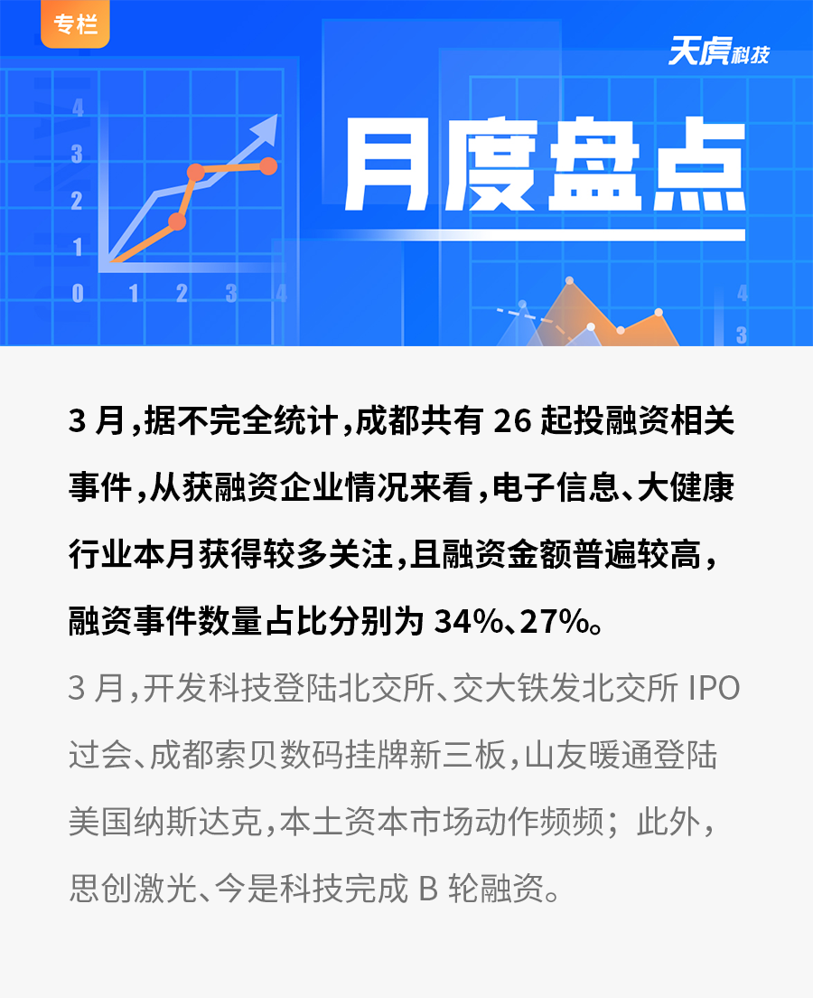 封面新闻获悉,3月,天虎科技共收录26起与成都科技创新创业相关的企业投融资事件,信息来源于公开融资事件披露、企业工商变更信息梳理、机构信息提供等,并对在中基协备案的注册地在成都的私募股权和创业投资基金(涉及251家基金管理机构所管理的784支基金)进行工商变更信息比对梳理,企查查亦提供部分信息支持。如有未收录的信息,欢迎投资机构和企业提供。