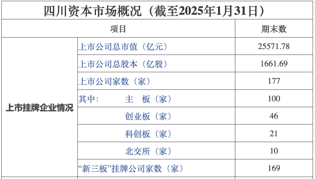 据中国证券监督管理委员会四川监管局官网3月4日统计显示,截至2024年1月31日,四川地区沪深上市公司共有177家,上市公司总市值25571.78亿元,其中主板100家,创业板46家,科创板21家,北交所10家,新三板挂牌公司169家。