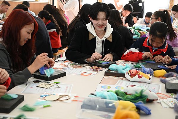 2026年4月28日,内蒙古通辽市科左中旗,留学生与小学生共同制作毛毡贴作品。当日,内蒙古民族大学来华留学生与科左中旗舍伯吐镇第一小学的学生们一同上中文课,参加国际中文日主题活动,以中文为桥增进交流、互鉴。 中新社记者 刘文华 摄
