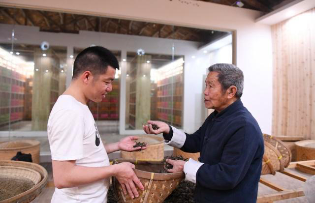 2019年3月,梅相靖(右)在点头镇柏柳村白茶作坊给他的儿子梅传銮讲解白茶的炭火烘焙工艺。 图据新华网