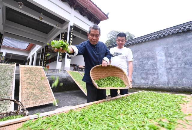 2019年3月21日,梅相靖(左)在点头镇柏柳村晾晒茶青。图据新华网