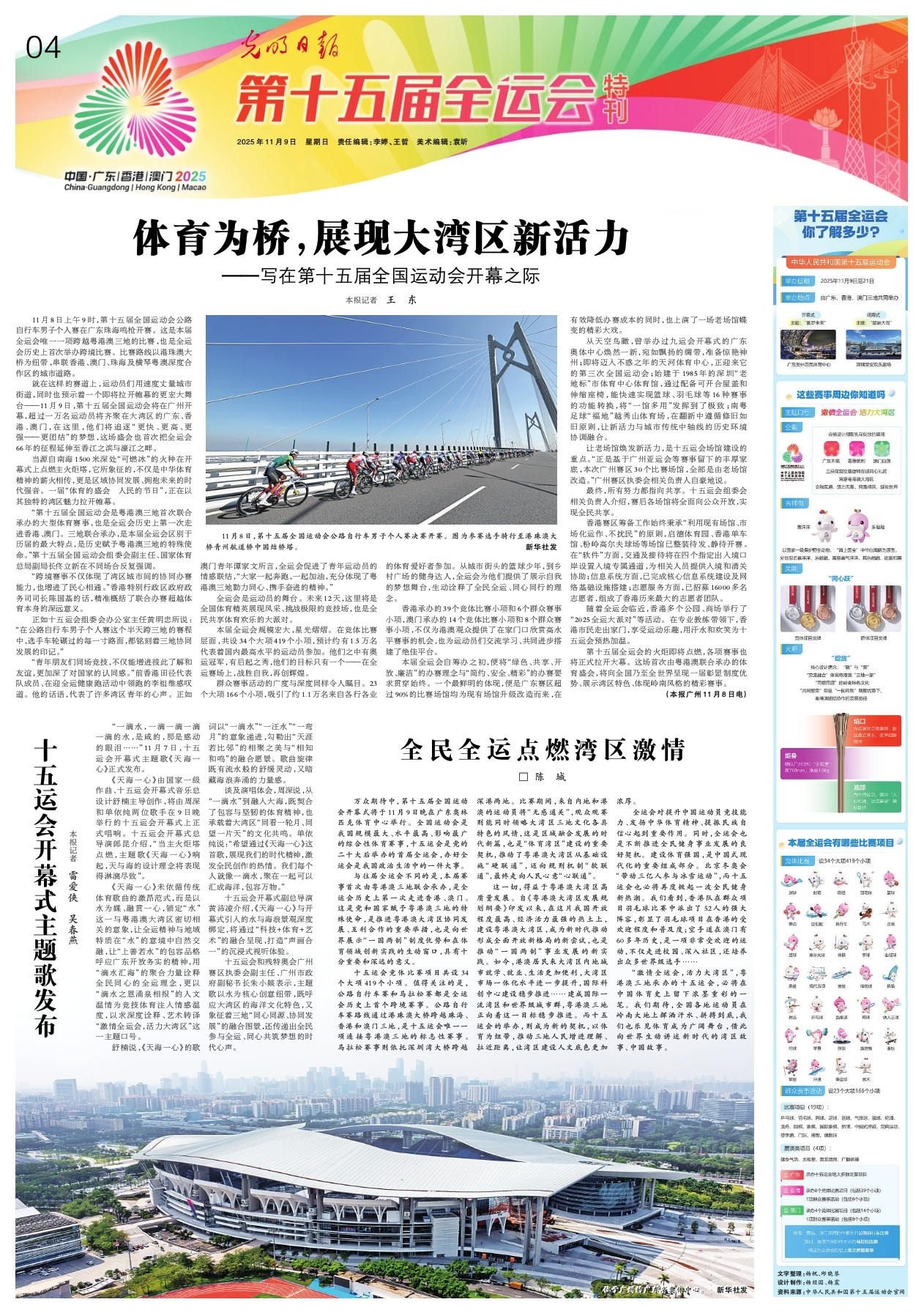 万众期待中,第十五届全国运动会开幕式将于11月9日晚在广东奥林匹克体育中心举行。全国运动会是我国规模最大、水平最高、影响最广的综合性体育赛事,十五运会是党的二十大后举办的首届全运会,办好全运会是我国政治生活中的一件大事。