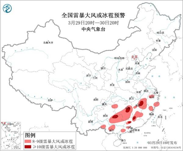 先来看3月29日到31日这轮过程,这是南方今年首轮大范围强对流天气过程,为短时强降雨与风雹混合型的对流。今天傍晚中央气象台继续发布暴雨蓝色和强对流黄色预警。
