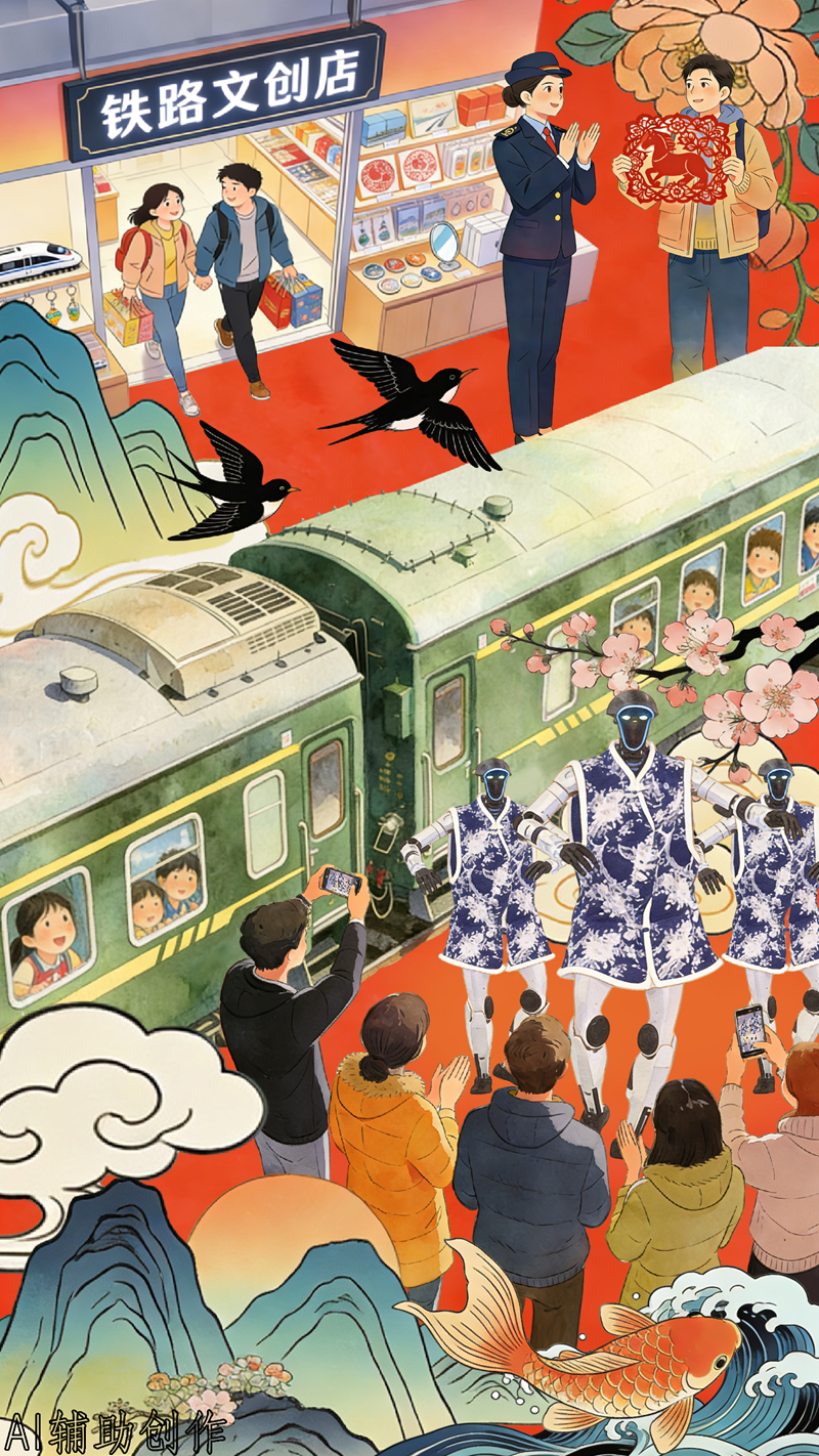 人工智能与传统文化的碰撞也是今年春运的一抹亮色。在江西景德镇北站,身着青花瓷纹样服饰的机器人与工作人员一同载歌载舞,当文化味撞上新科技,妙趣横生的表演不仅让旅途暖了起来,更将一份融合了传统与现代的独特年味,装进旅客的行囊,带往四面八方。
