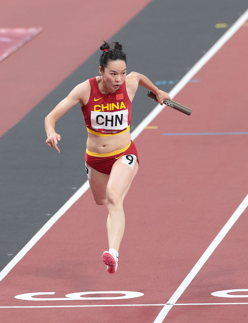 2021年8月6日,中国队队员韦永丽在比赛中。当日,东京奥运会田径女子4x100米接力决赛在新国立竞技场举行。新华社记者 李钢 摄
