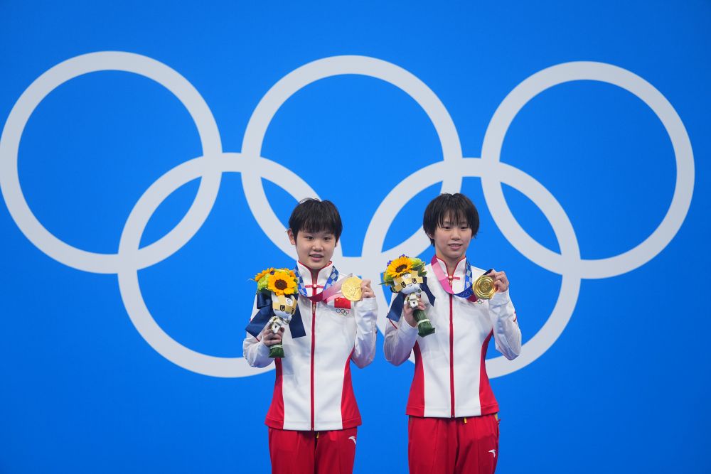 2021年7月27日,中国选手陈芋汐(右)和张家齐在颁奖仪式上。当日,在东京奥运会跳水女子双人10米跳台决赛中,陈芋汐/张家齐夺得冠军。新华社记者 许畅 摄