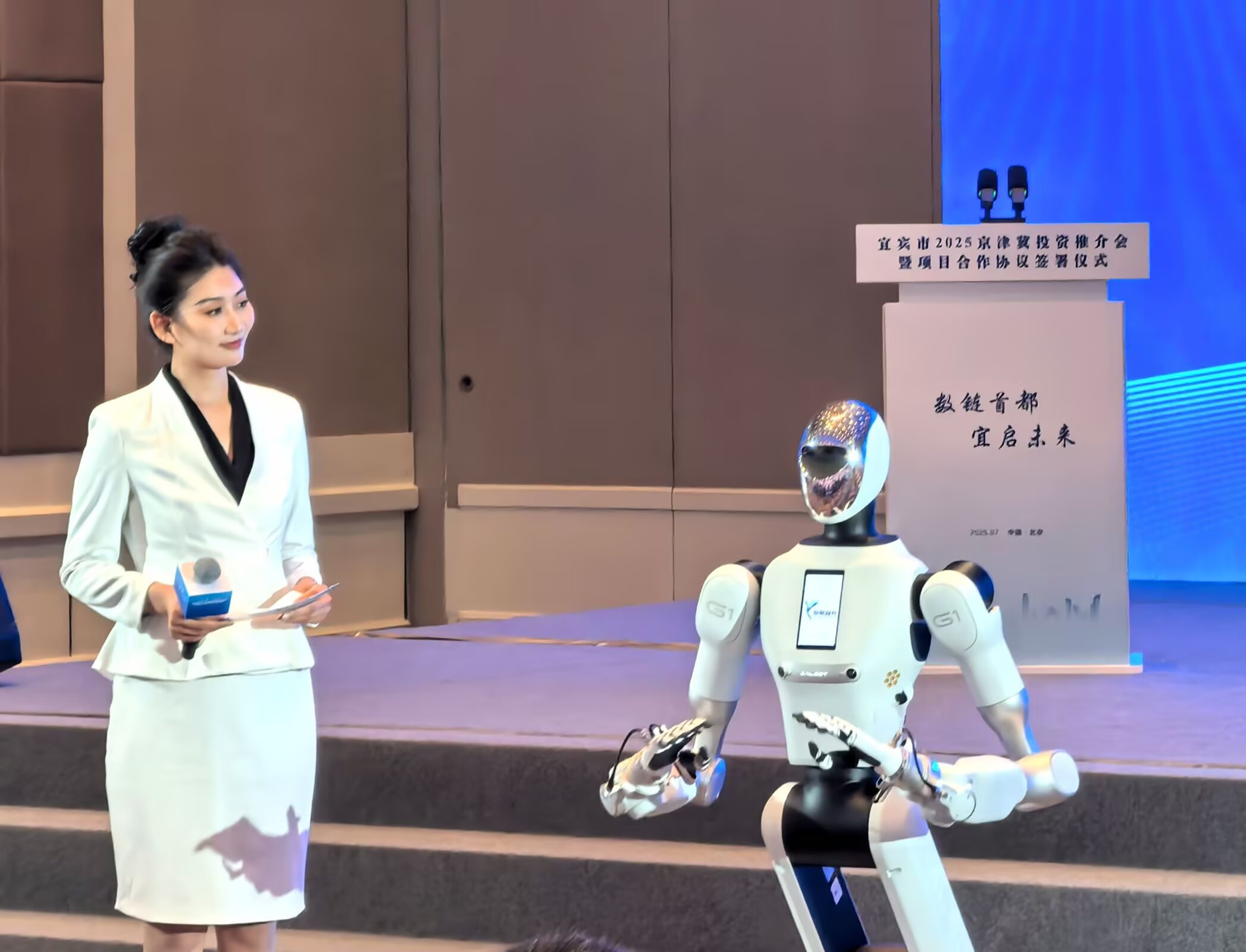 “宜宾造”机器人亮相宜宾市2025京津冀投资推介会。(伍雪梅 摄)