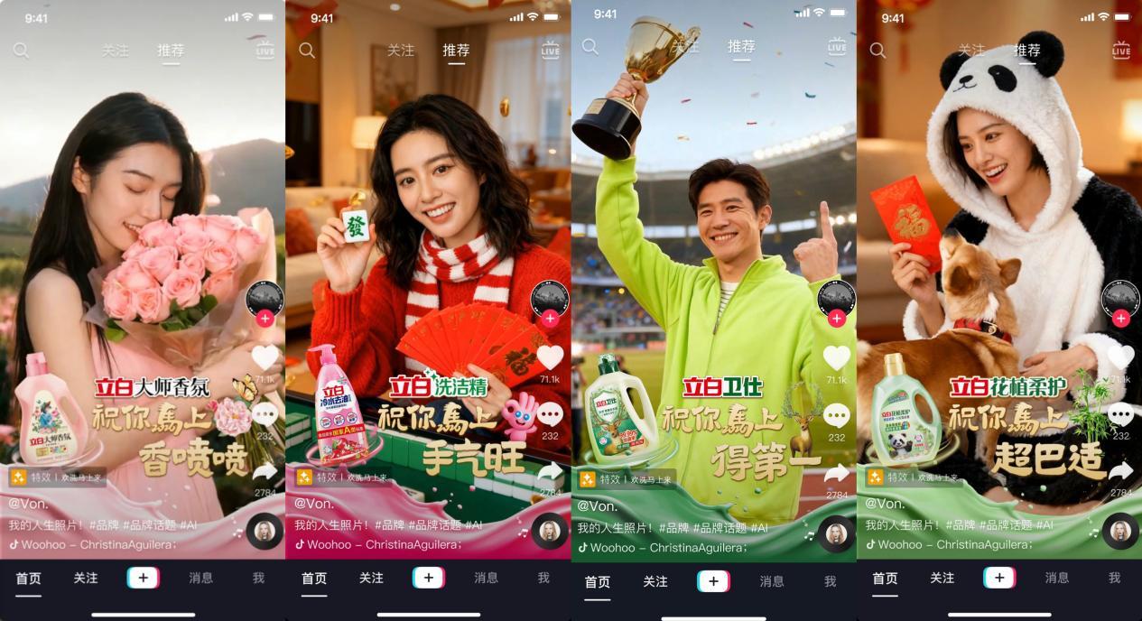 只需一张照片,用户就能通过抖音立白“‘欢洗’马上来”AI贴纸特效,生成属于自己的马年好运视频。