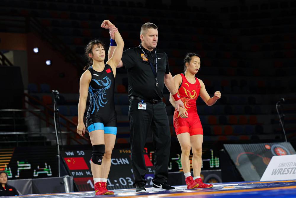 女子自由式摔跤50公斤级决赛,冯紫琪(左)战胜队友范猛获得冠军。图片来自世界摔跤联合会官网