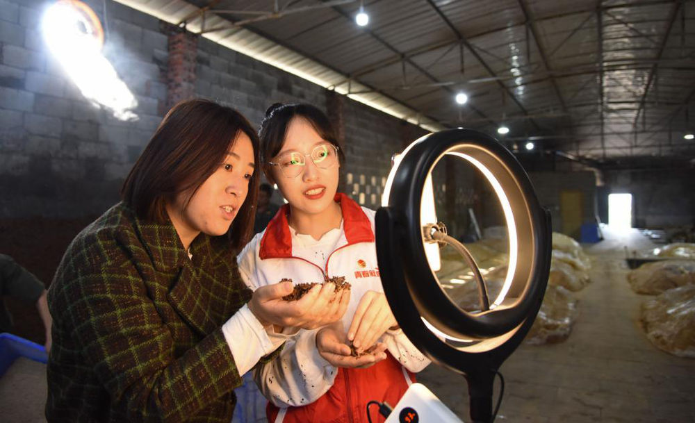 11月10日,四川省叙永县正东镇一家白酒企业扶贫生产车间内,共青团叙永县委的创业导师正在和创业青年进行网上直播,推销当地土特产品。李欣 摄