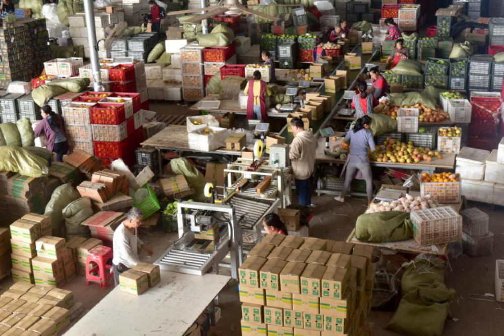 11月10日,四川内江东兴区高梁镇晓乡种植专业合作社,村民们正在车间内分拣、打包各类水果。这个合作社主要承接农产品和水果的订单封装、发货业务,并通过多个电商平台销往全国各地。黄正华摄