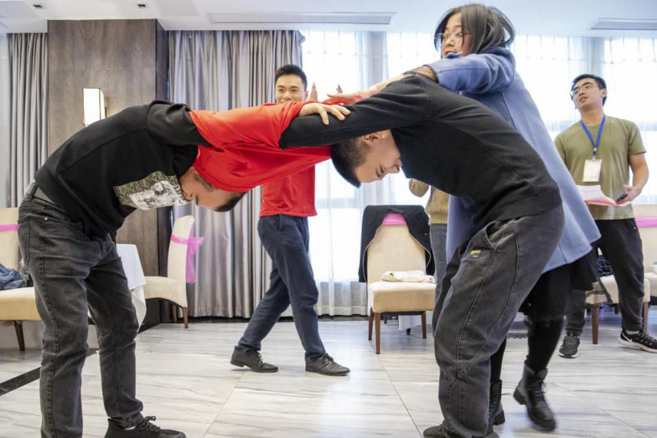 11月10日,在四川省广安市前锋区举办的“青春相约·缘启前锋” 相亲活动上,青年男女在做“脱单到底”游戏。周修建摄