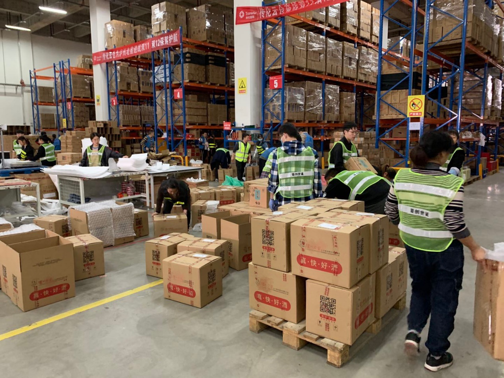 11月11日,仓库处于一派忙碌景象,得益于合理的作业区规划。今年大家并不是一股脑地投入到了生产作业之中,除了生产作业人员,还配备一部分负责质检的人员,确保操作符合要求,避免错发漏发的情况。而云仓的工作人员主要负责异常处理和外部联络,类似于退货、快递运力不够、快递面单打印出现问题等等,都能够及时处理。