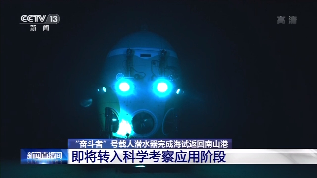总台央视记者 田琪永:这里是海南三亚的南山港。今天上午,“探索一号”科考母船搭载着“奋斗者”号载人潜水器,从太平洋顺利返航。这标志着“奋斗者”号载人潜水器在完成了万米深潜海试之后,即将转入科学考察应用阶段。这为我国进一步开展大洋深渊科学研究提供了关键的技术装备。