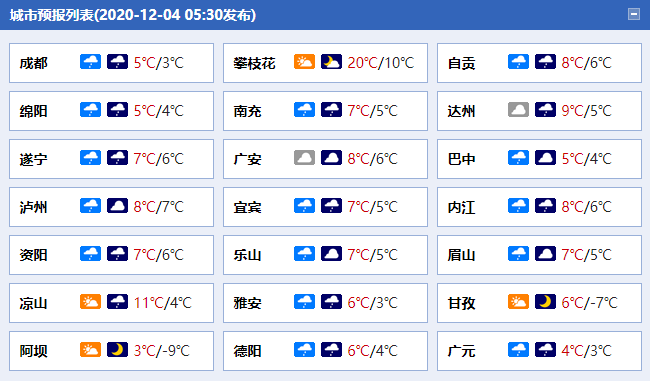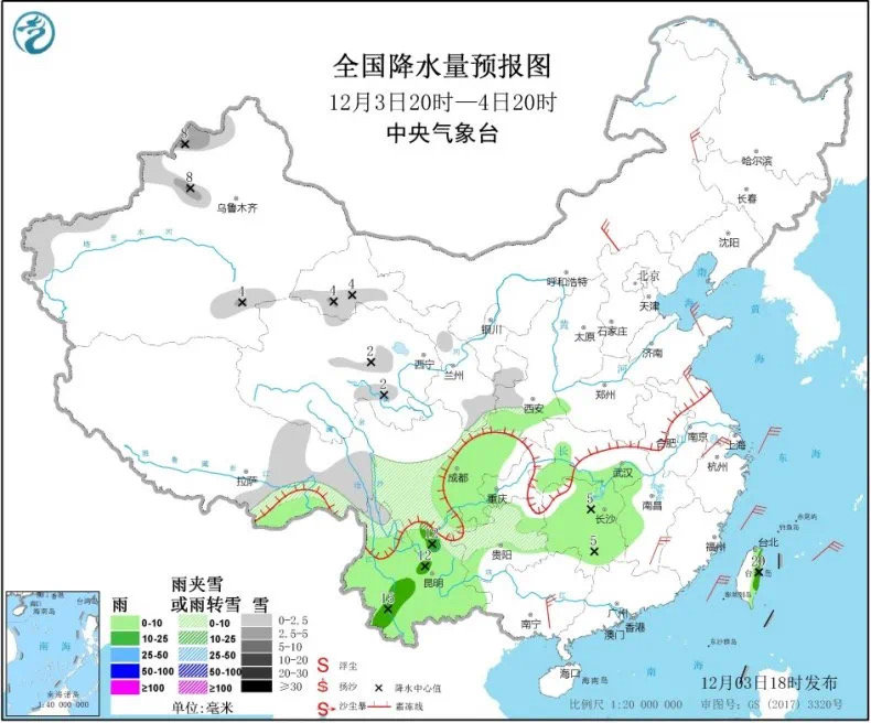 中央气象台预计,3日20时至4日20时,新疆西部、青藏高原、西北地区东南部、川西高原等地部分地区有小雪或雨夹雪,其中,新疆伊犁河谷和塔城地区等地有中到大雪。江汉东部、西南地区大部、台湾岛等地部分地区有小雨,局地有中雨。