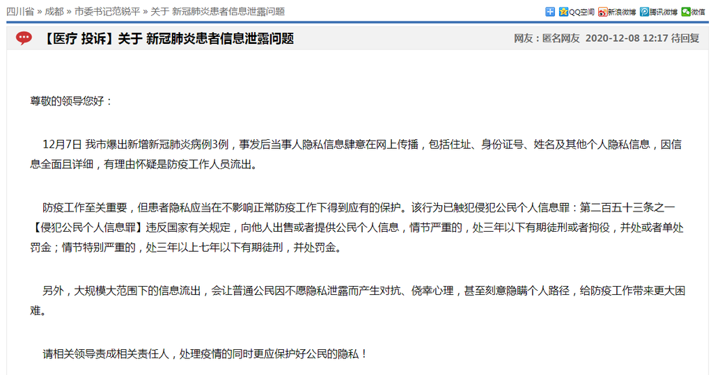 对此,有网友通过四川日报“问政四川”留言,认为“对该患者进行诋毁、辱骂,以及恶意揣测该患者职业,患者个人隐私信息的泄露无疑将对当事人当前及今后生活造成巨大的困扰。恳请有关部门加强对公民隐私的保护及有关工作宣传力度,同时对泄露公民隐私者不姑息迁就,依法追责。”