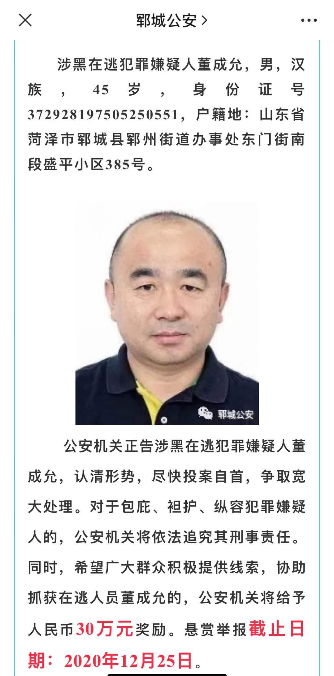 此前,郓城县公安局曾于2019年、2020年分别悬赏10万元、20万元对董成允网上追逃。