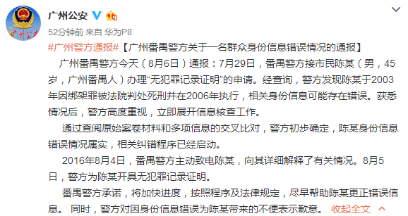 封面新闻讯 据广州市公安局官方微博消息,广州番禺警方今天(8月6日)通报:7月29日,番禺警方接市民陈某(男,45岁,广州番禺人)办理“无犯罪记录证明”的申请。经查询,警方发现陈某于2003年因绑架罪被法院判处死刑并在2006年执行,相关身份信息可能存在错误。获悉情况后,警方高度重视,立即展开信息核查工作。