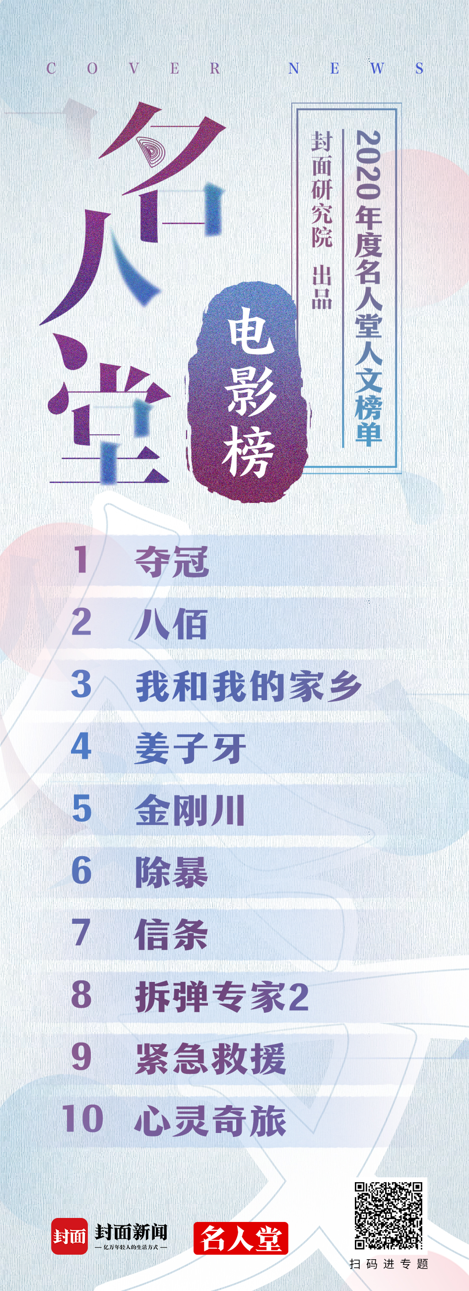 2020年临近尾声,由封面新闻、华西都市报主办,封面研究院组织评选和发布的2020名人堂年度人文榜•电影榜出炉,根据猫眼电影的全年票房数据、封面研究院人文研究所提供的热搜排名,以及影片自身的社会影响力综合评判,最终代表中国参赛明年奥斯卡国际影片奖的《夺冠》“夺冠”今年票房头名,《八佰》位居次席,正能量口碑之作《我和我的家乡》排第三。