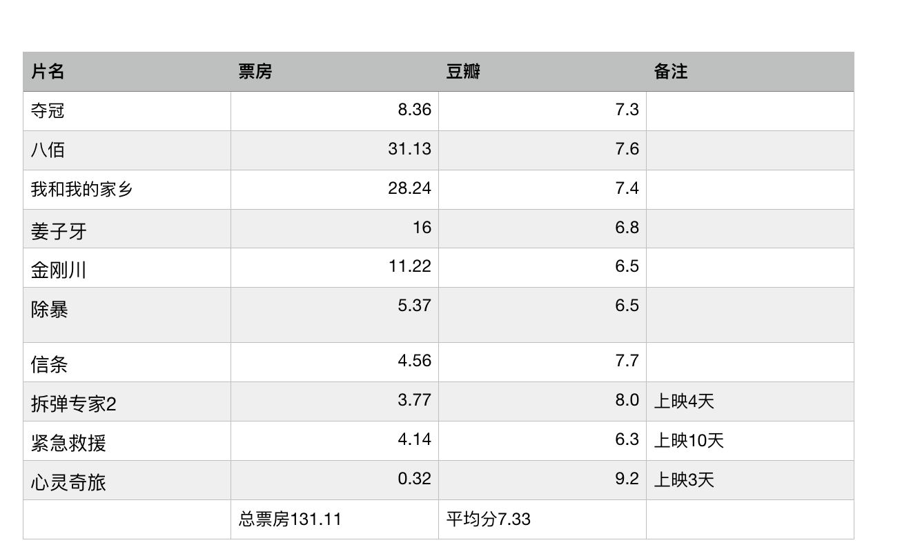 今年新冠疫情虽然在上半年重创中国影市,但得力于国家对疫情防控取得诸多成效。7月20日,关闭多时的中国院线全面重开,影市持续回暖。根据国家电影专资办统计:2020年国庆档期(10月1日至8日),全国电影票房共产出39.52亿元,吸引近1亿人次观影。其中,《我和我的家乡》以18.7亿元票房成绩领跑“国庆档”;《姜子牙》13.84亿票房紧随其后,《夺冠》在国庆期间也斩获了3.6亿元票房收入。