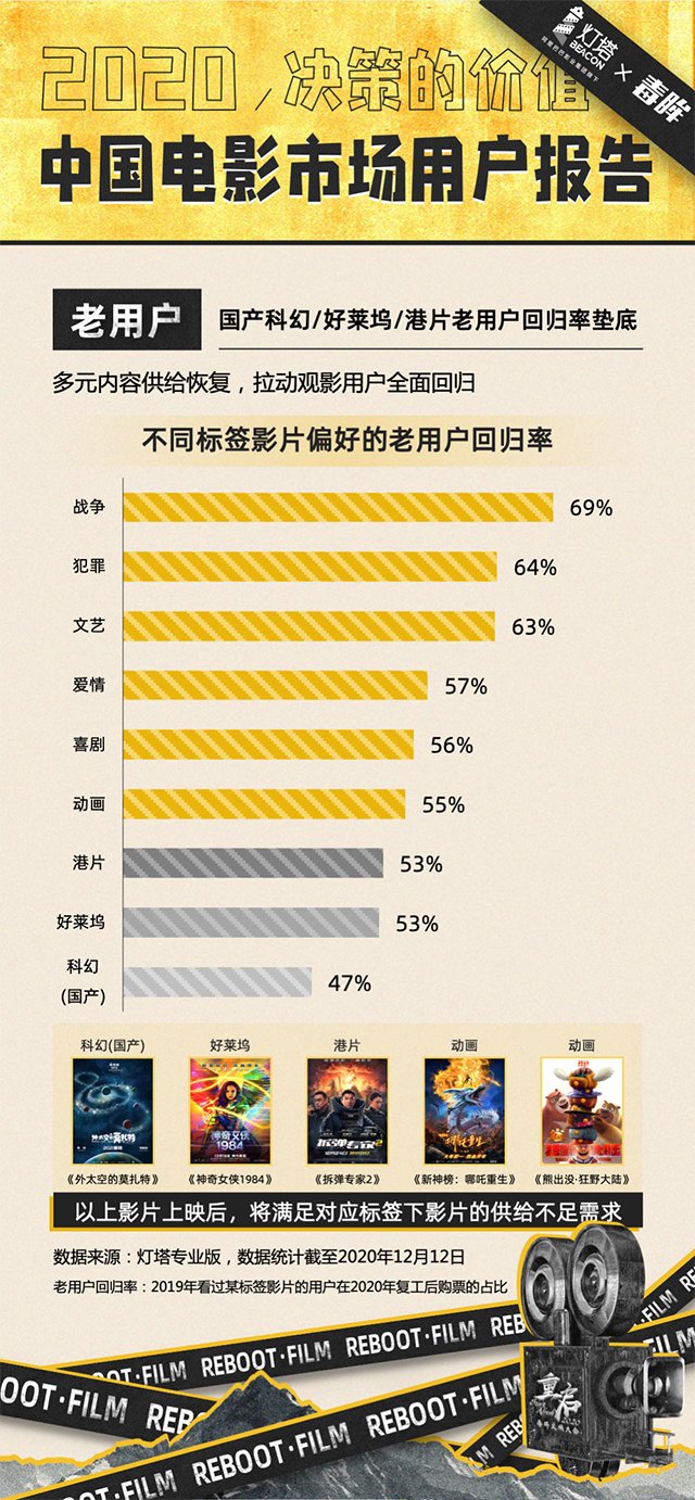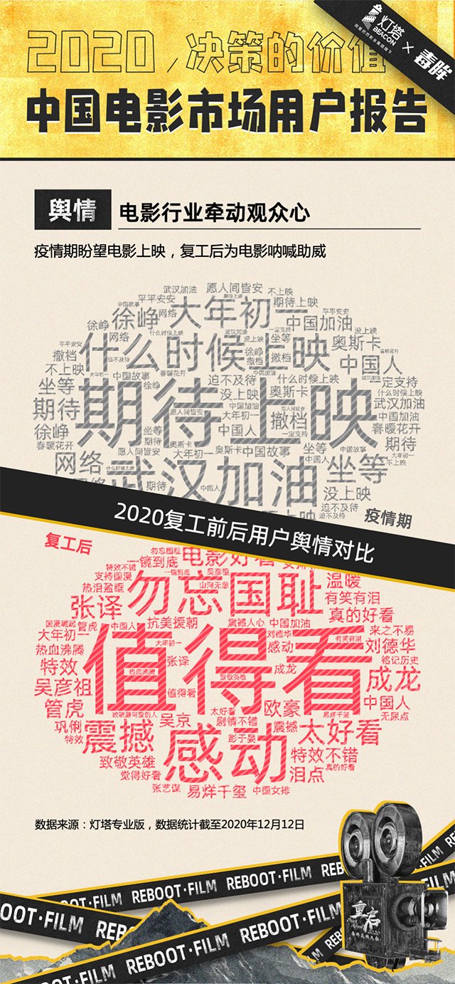 除了上述四部影片,年度十大影片中,《信条》和《紧急救援》也是爽感十足的影片,两部影片都主打男性观众。早在今年3月疫情还比较严重的时候,阿里影业旗下灯塔研究院就推出了《2020年中国电影市场复苏策略报告》,报告显示:影市复苏后“90后”高频观影男性将成核心用户。影院观影态度最积极的,是25岁以下的四线城市年轻男性。