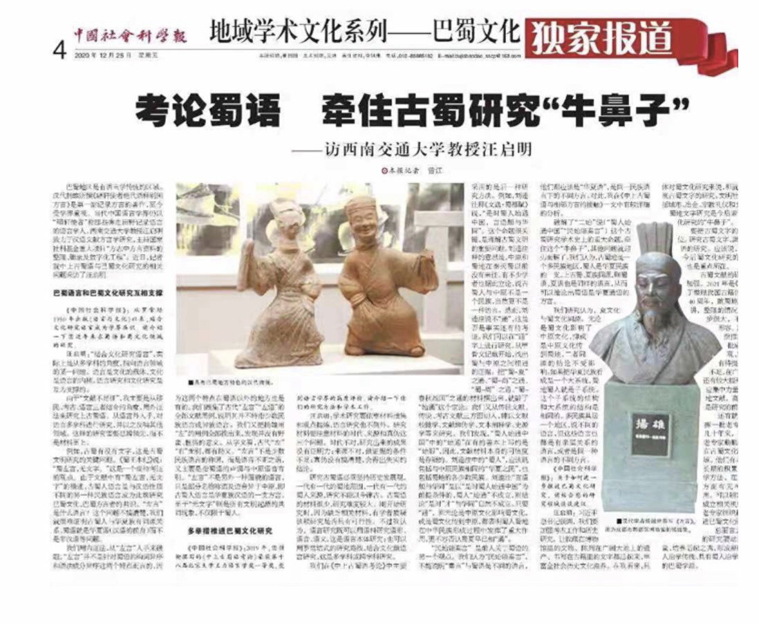2020年12月25日,《中国社会科学报》刊发了一篇名为《考论蜀语 牵住古蜀研究“牛鼻子”》的详细报道。该报道以“地域学术文化系列——巴蜀文化”为策划主题,以长篇专访的形式,隆重介绍了汪启明教授以及他近年来在蜀语和蜀文化领域的研究成果和心得。在这篇文章中,汪启明着重提出,蜀地文字研究是今后若干年古蜀文化研究的“牛鼻子”。