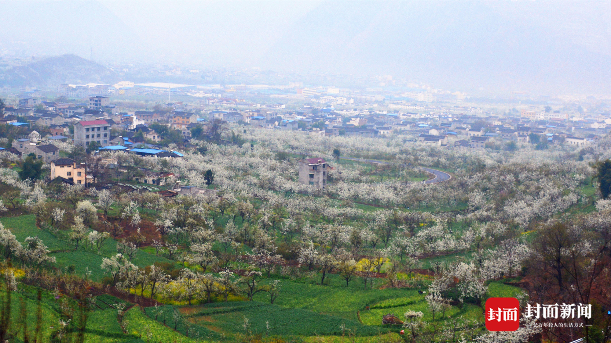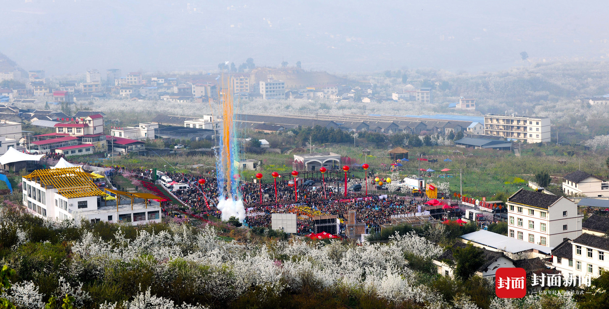 开幕式会场位于九襄镇三强村花神广场。站在高处往下看,20万亩梨花正迎着阳光怒放,洁白的梨花皎洁如雪,连在一起仿佛为田野乡村,披上了一层薄薄的轻纱。走入其中,清香随风扑面而来,千姿百态的梨树上,一串串梨花开得正好,山坡上、道路旁、田野里、房前屋后都是花的世界。