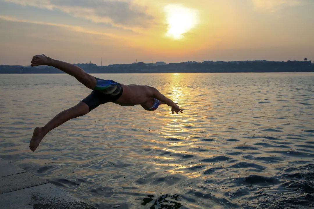 湖北襄阳,冬泳爱好者迎着清晨的阳光跳入冰冷的汉江,以畅游的形式迎接新年的到来。