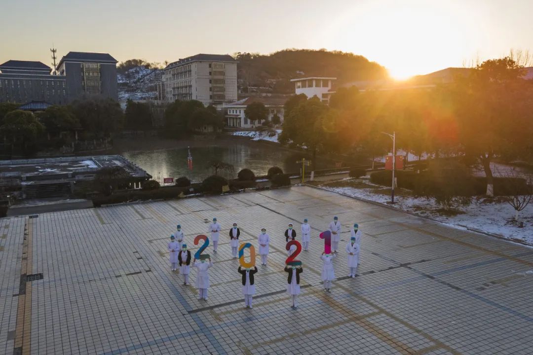 江苏镇江,镇江市第三人民医院(镇江市传染病医院),医护人员在值完跨年夜班后来到广场上迎接新年第一缕阳光。