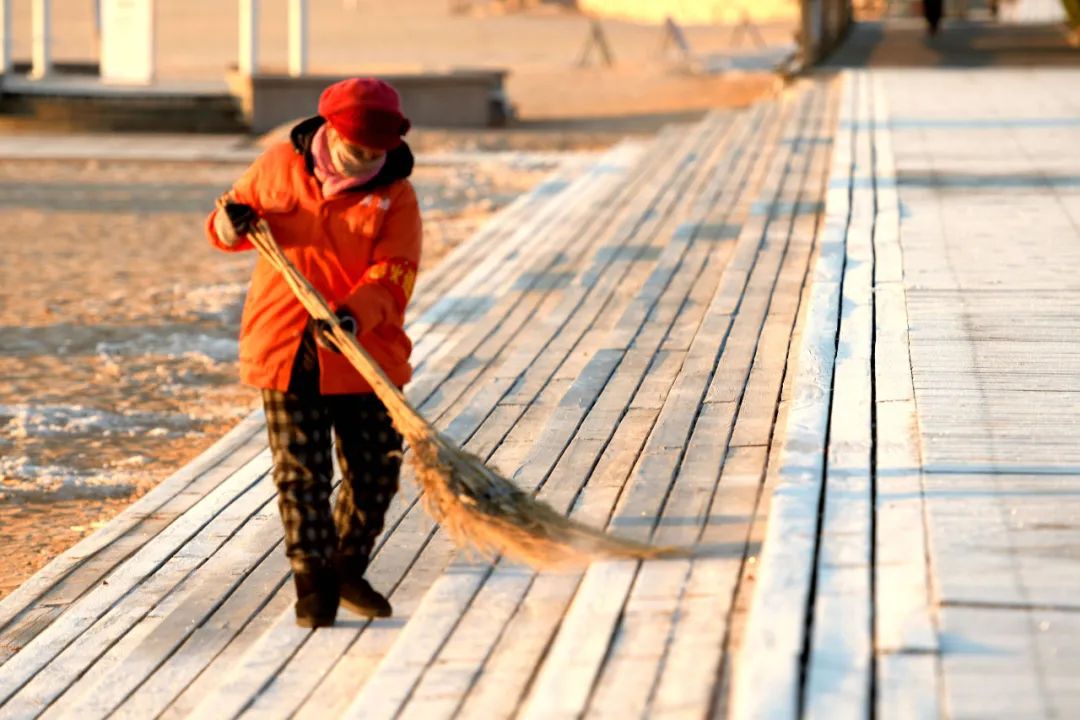山东青岛西海岸新区金沙滩海水浴场,一位环卫工人在清扫木栈道霜冻。