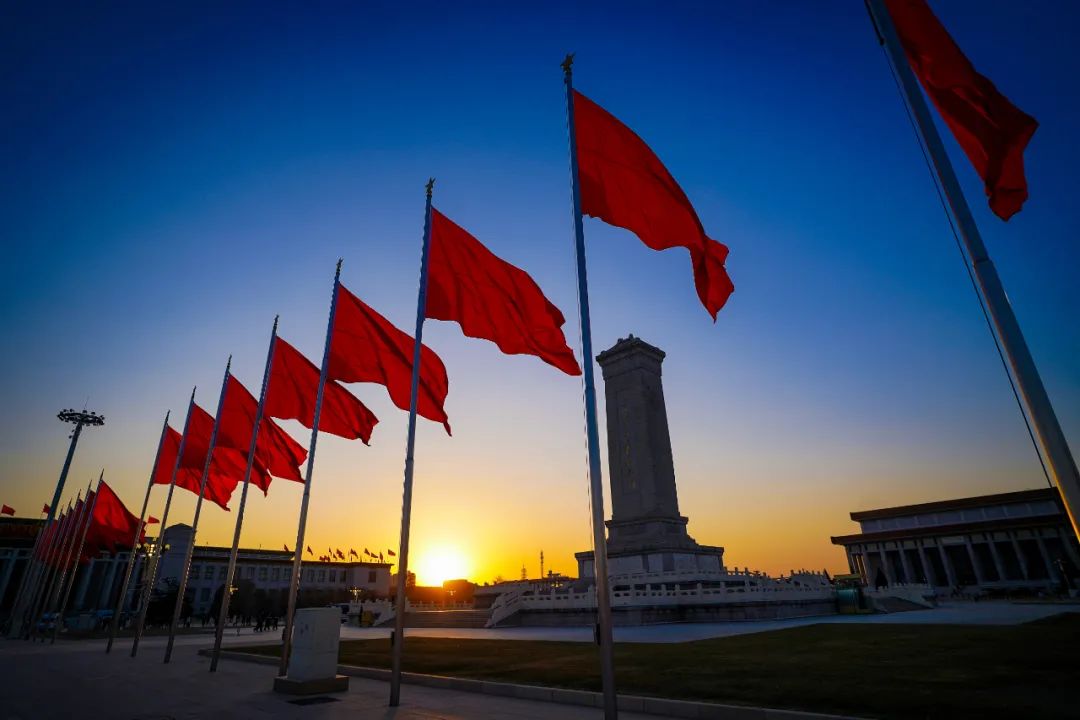 在新年曙光的照耀下,北京天安门广场的红旗迎风飘扬。