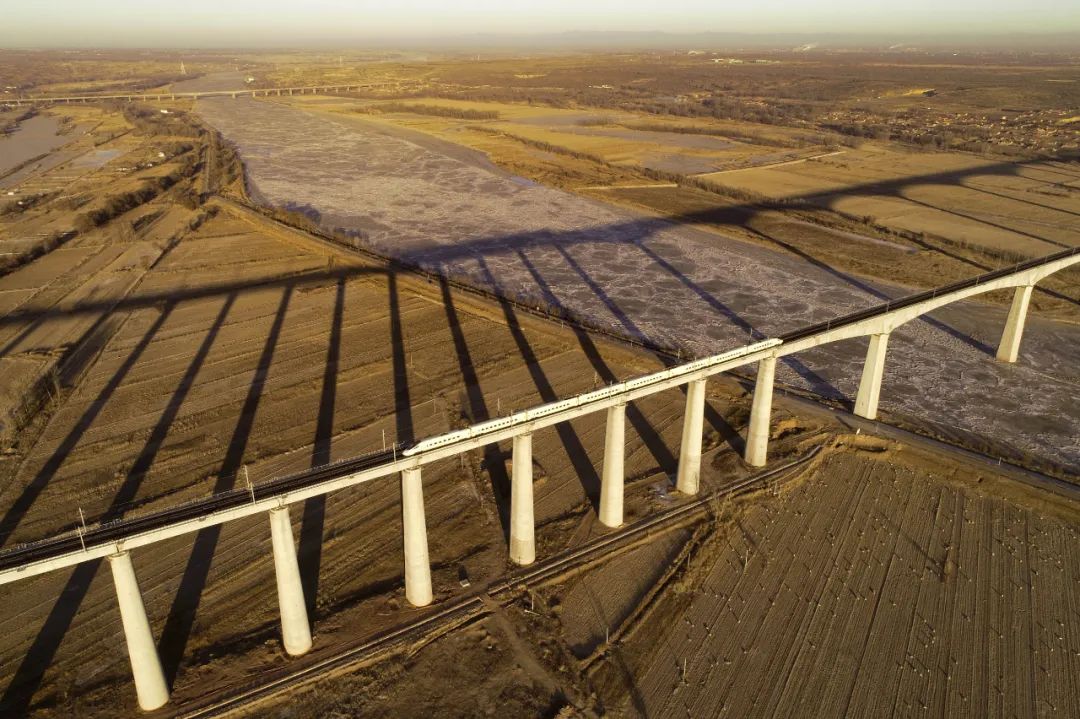 内蒙古自治区鄂尔多斯,准格尔旗大路镇黄河大桥被一轮暖阳点亮(无人机照片)。