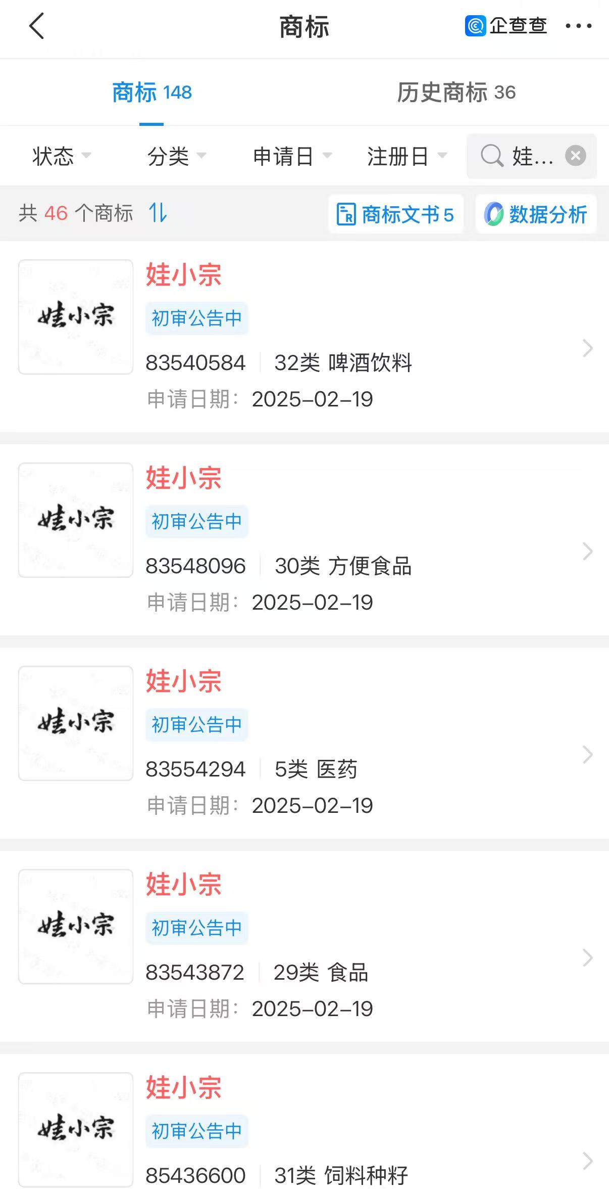辞职的同时,宗馥莉已悄然布局替代方案。据企查查数据:其担任董事的宏胜饮料集团自2025年2月起申请多枚 “娃小宗”等商标,涉及全品类。值得注意的是,近期该商标进入初审。