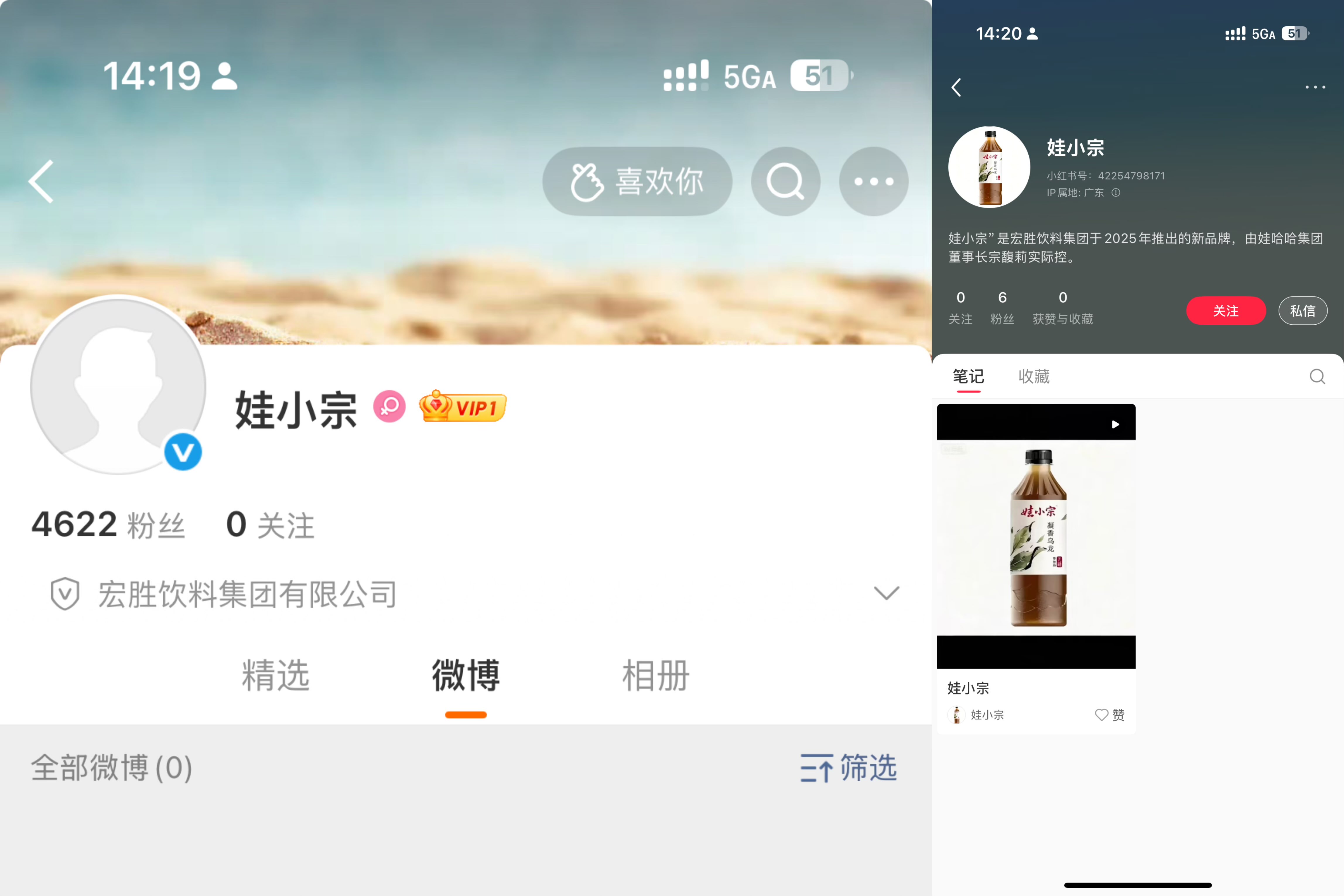 另外,封面新闻记者发现,娃小宗已在微博和小红书平台注册账号,账号认证主体为宏胜饮料集团有限公司。截至发稿,微博账号已有4622个粉丝、小红书6个粉丝。