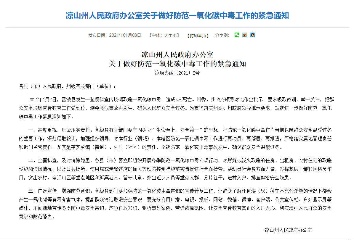 1月8日,凉山州人民政府办公室发布《凉山州人民政府办公室关于做好防范一氧化碳中毒工作的紧急通知》。据《通知》,1月7日,雷波县发生一起疑似室内烧碳取暖一氧化碳中毒,造成5人死亡。